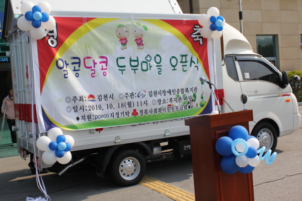 김천시장애인종합복지관(관장 박선하)은 10월 18일(월) 오전 11시부터 복지관 마당에서 경북사회복지공동모금회 2010년 테마기획사업으로 선정된「포스코와 함께하는 장애인직업재활프로그램」알콩달콩 두부마을 오픈식을 가졌다.