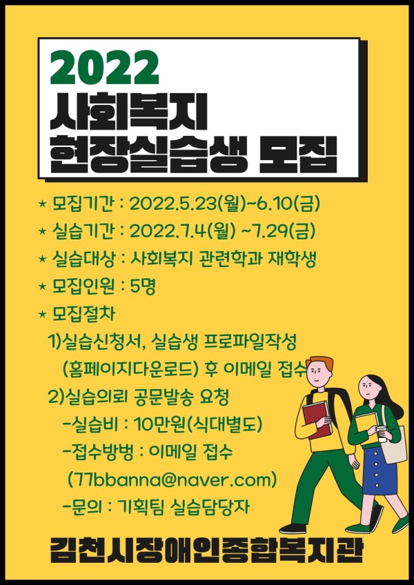 2022 사회복지현장실습생 모집 게시글 작성정보 작성자 김천시장애인복지관 작성일 22-05-23 15:05 조회수 2,119 댓글수 0 목록 게시글 본문 첨부파일 2개 2022실습생모집.jpg (588.9K) 53회 다운로드 첨부일시 : 2022-05-23 15:05:33 사회복지현장실습_신청_양식김천장복.hwp (36.5K) 158회 다운로드 첨부일시 : 2022-05-23 15:05:33 이전글 2022년 제2회 직원채용 공고(심리치료사, 사회복지사) 22-05-27 다음글 2022년 제1회 직원채용 합격자 공고 및 임용등록 안내 22-03-26 댓글 0 등록된 댓글이 없습니다. 목록
