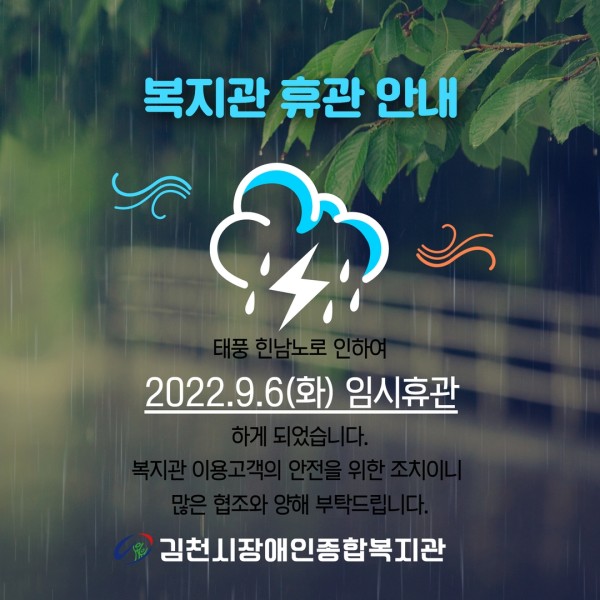 임시휴관 안내 게시글 작성정보 작성자 김천시장애인복지관 작성일 22-09-05 15:54 조회수 1,842 댓글수 0 목록 게시글 본문 첨부파일 1개 제목을 입력하세요.jpg (740.9K) 57회 다운로드 첨부일시 : 2022-09-05 16:15:46 이전글 2022년 제4차 운영위원회 결과보고 22-09-16 다음글 2022년 제2회 발달장애인주간활동서비스 제공인력 합격자 공고 및 임용 등록 안내 22-07-29 댓글 0 등록된 댓글이 없습니다. 목록