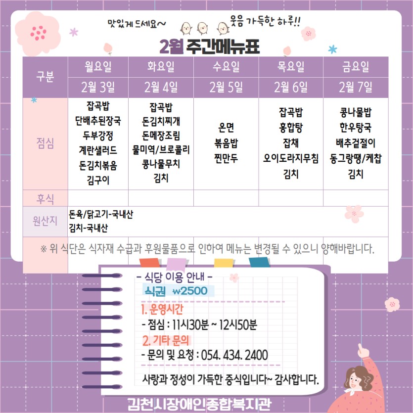 [게시판] 2월 첫째주 주간 메뉴표입니다.