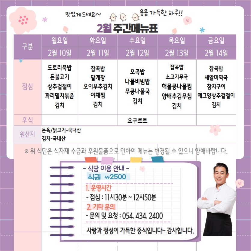 [게시판]2월 둘째주 주간 메뉴표입니다.