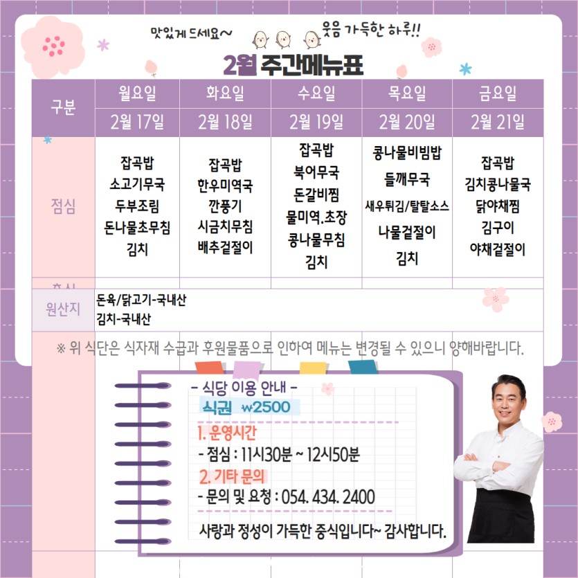 [게시판]2월 셋째주 주간 메뉴표입니다.