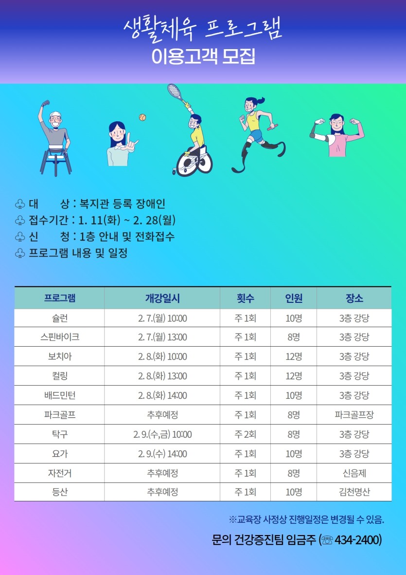 [게시판]생활체육 프로그램 이용고객 모집 게시글 작성정보 작성자 김천시장애인복지관 작성일 22-01-12 15:11 조회수 1,683 댓글수 0 목록 게시글 본문 첨부파일 1개 생활체육프로그램 이용고객모집.jpg (658.0K) 1회 다운로드 첨부일시 : 2022-01-12 15:11:51 이전글 [게시판]이미용서비스 안내 22-01-20 다음글 [게시판]평생교육 프로그램 이용고객 모집 22-01-12 댓글 0 등록된 댓글이 없습니다. 목록