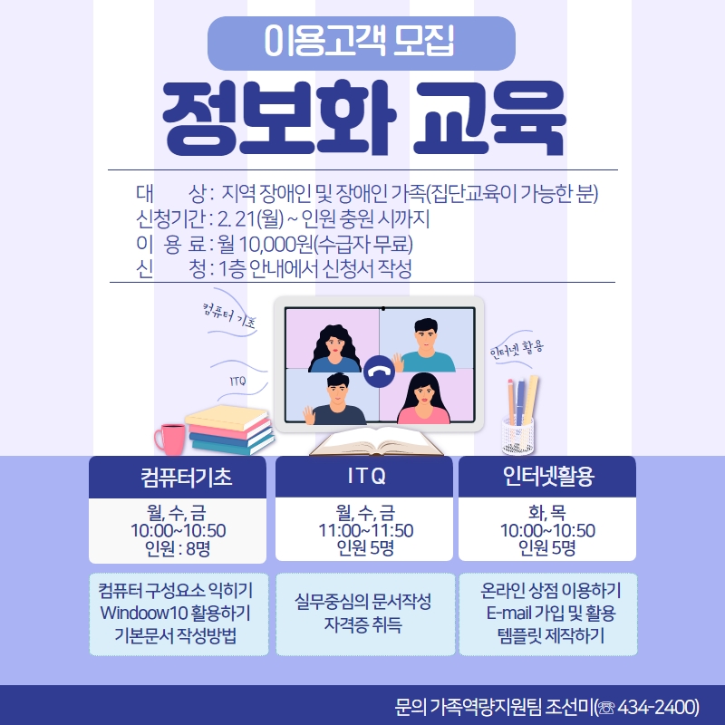 [게시판]정보화교육 이용고객 모집 게시글 작성정보 작성자 김천시장애인복지관 작성일 22-02-21 10:05 조회수 1,503 댓글수 0 목록 게시글 본문 첨부파일 1개 제목을 입력하세요 7.jpg (242.6K) 1회 다운로드 첨부일시 : 2022-02-21 10:05:10 이전글 [게시판]2022년도 지방장애인기능경기대회 22-03-07 다음글 [게시판]이미용서비스 안내 22-01-20 댓글 0 등록된 댓글이 없습니다. 목록