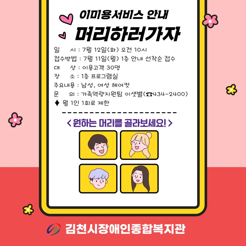 [게시판]이미용서비스 안내 게시글 작성정보 작성자 김천시장애인복지관 작성일 22-07-05 13:59 조회수 1,377 댓글수 0 목록 게시글 본문 첨부파일 1개 이미용서비스 안내 8.jpg (206.4K) 1회 다운로드 첨부일시 : 2022-07-05 13:59:47 이전글 [게시판]장애인 자조모임 안내 22-07-11 다음글 [보도자료]“17년간 열심히 달려온 의미 있는 시간” 관장 박선하 정년 퇴임식 22-06-30 댓글 0 등록된 댓글이 없습니다. 목록