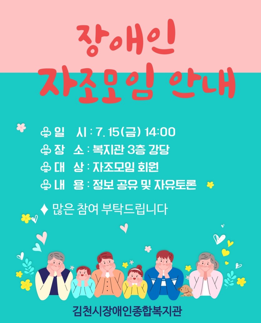 [게시판]장애인 자조모임 안내 게시글 작성정보 작성자 김천시장애인복지관 작성일 22-07-11 13:17 조회수 1,512 댓글수 0 목록 게시글 본문 첨부파일 1개 장애인자조모임 안내 1.jpg (363.7K) 1회 다운로드 첨부일시 : 2022-07-11 13:17:24 이전글 [게시판]여름계절학교&창의융합교육 참여 학생 모집 22-07-11 다음글 [게시판]이미용서비스 안내 22-07-05 댓글 0 등록된 댓글이 없습니다. 목록