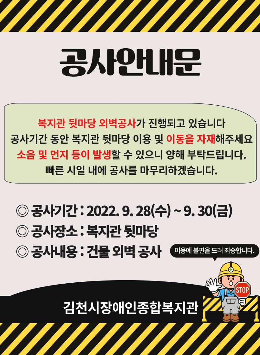 [게시판]복지관 공사 안내 게시글 작성정보 작성자 김천시장애인복지관 작성일 22-09-28 11:26 조회수 1,257 댓글수 0 목록 게시글 본문 첨부파일 1개 제목을 입력하세요 72.jpg (2.0M) 1회 다운로드 첨부일시 : 2022-09-28 11:26:55 이전글 [보도자료]“김천시 건강면 공치리(072)”파크골프 22-09-29 다음글 [게시판]이미용서비스 안내 22-09-20 댓글 0 등록된 댓글이 없습니다. 목록
