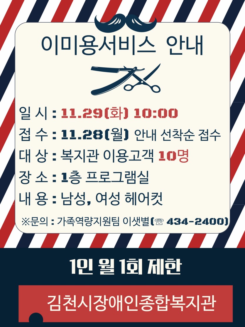 [게시판]이미용서비스 안내 게시글 작성정보 작성자 김천시장애인복지관 작성일 22-11-22 10:00 조회수 1,231 댓글수 0 목록 게시글 본문 첨부파일 1개 이미용서비스 안내 new 9.jpg (799.9K) 1회 다운로드 첨부일시 : 2022-11-22 10:00:20 이전글 [게시판]장애인자조모임 안내 22-11-22 다음글 [게시판]도서욕구조사 안내 22-11-10 댓글 0 등록된 댓글이 없습니다. 목록
