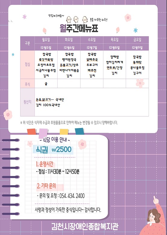 [게시판]복지관 집단급식소 주간 식단표 게시글 작성정보 작성자 김천시장애인복지관 작성일 22-12-05 09:47 조회수 1,268 댓글수 0 목록 게시글 본문 첨부파일 1개 주간식단표1.jpg (97.8K) 1회 다운로드 첨부일시 : 2022-12-08 11:09:46 이전글 [게시판]송년행사 안내 22-12-06 다음글 [게시판]장애인일자리사업 참여자모집 22-11-28 댓글 0 등록된 댓글이 없습니다. 목록