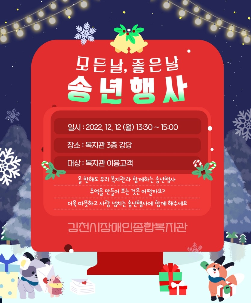 [게시판]송년행사 안내 게시글 작성정보 작성자 김천시장애인복지관 작성일 22-12-06 17:20 조회수 1,230 댓글수 0 목록 게시글 본문 첨부파일 1개 한마음대잔치 5.jpg (545.1K) 2회 다운로드 첨부일시 : 2022-12-06 17:20:50 이전글 [게시판]이미용서비스 안내 22-12-07 다음글 [게시판]복지관 집단급식소 주간 식단표 22-12-05 댓글 0 등록된 댓글이 없습니다. 목록