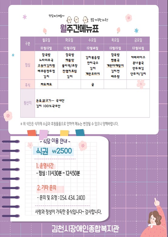 [게시판]복지관 집단급식소 주간 식단표 게시글 작성정보 작성자 김천시장애인복지관 작성일 22-12-09 11:04 조회수 1,247 댓글수 0 목록 게시글 본문 첨부파일 1개 주간식단표1.jpg (98.5K) 1회 다운로드 첨부일시 : 2022-12-09 11:04:40 이전글 [보도자료]“모든날, 좋은날” 송년 행사 성황리 개최 22-12-12 다음글 [게시판]이미용서비스 안내 22-12-07 댓글 0 등록된 댓글이 없습니다. 목록