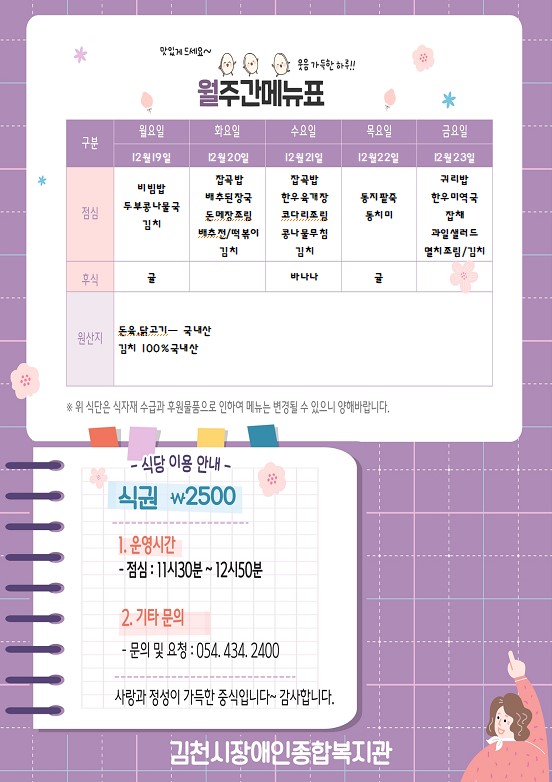 [게시판]복지관 집단급식소 주간 식단표 게시글 작성정보 작성자 김천시장애인복지관 작성일 22-12-15 11:27 조회수 1,323 댓글수 0 목록 게시글 본문 첨부파일 1개 주간식단표2.jpg (94.3K) 0회 다운로드 첨부일시 : 2022-12-15 11:27:52 이전글 [게시판]장애인복지일자리 선발자 명단 22-12-22 다음글 [보도자료]“모든날, 좋은날” 송년 행사 성황리 개최 22-12-12 댓글 0 등록된 댓글이 없습니다. 목록