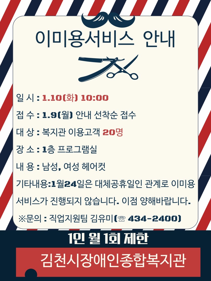 [게시판]이미용서비스 안내 게시글 작성정보 작성자 김천시장애인복지관 작성일 23-01-04 18:06 조회수 1,209 댓글수 0 목록 게시글 본문 첨부파일 1개 1.4 이미용서비스 안내.jpg (815.9K) 0회 다운로드 첨부일시 : 2023-01-04 18:06:55 이전글 [게시판]정보화교육 이용고객 모집 23-01-05 다음글 [게시판]장애인식개선 책으로공감 공모전 수상자 22-12-30 댓글 0 등록된 댓글이 없습니다. 목록