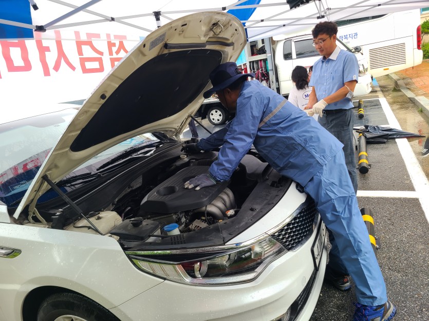 장애인차량점검은 연2회 실시하는 사업으로 이번 점검에서는 기아자동차 김천지점이 복지관 주차장 안에서 기본점검(워셔액 충전, 각종 오일류, 타이어 공기압 체크, 라이트 점검 등)과 윈도우 브러쉬 교체를 진행하였다.