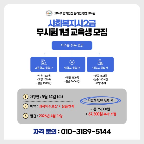 [공고] 사회복지2급, 무시험 1년 과정 교육생 모집