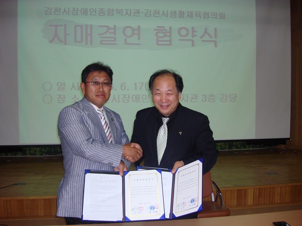 6월 17일(화) 17시부터 복지관 3층 강당에서 장애인들의 건강증진 및 생활체육 활성화를 위하여 김천시생활체육협의회(회장 서종환)와 자매결연을 체결하였습니다.